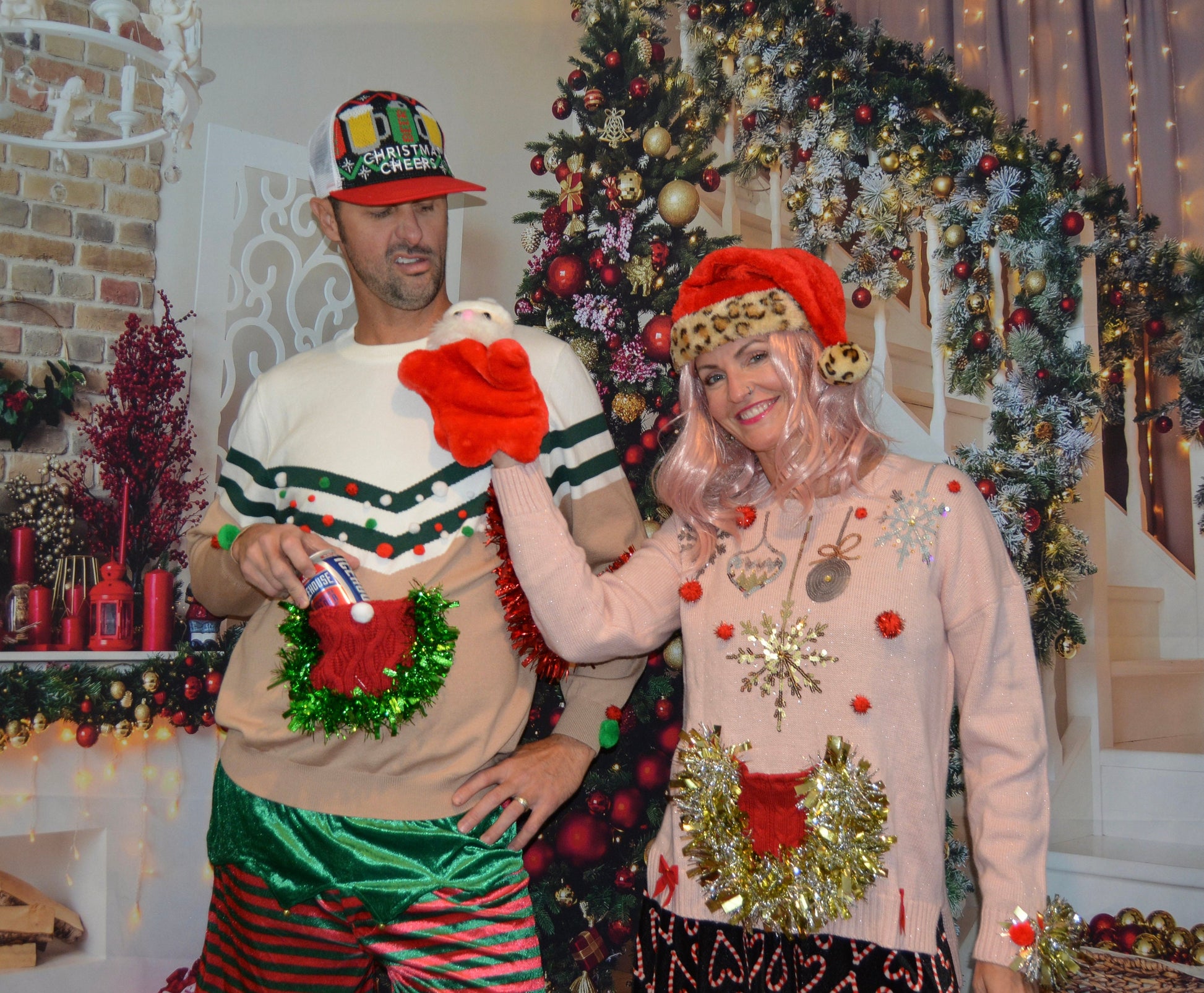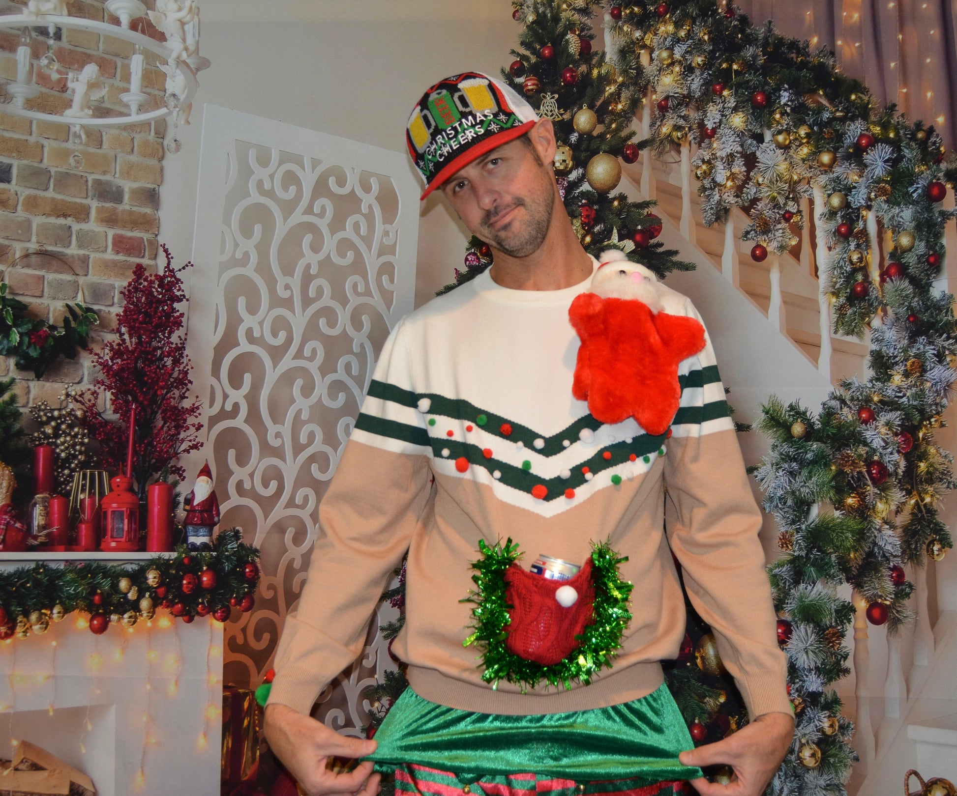 M/L Ugly Christmas Sweater, liquor pocket, hand puppet, flask holder, Party Sweater, men's, alcohol, beer holder, contest winner