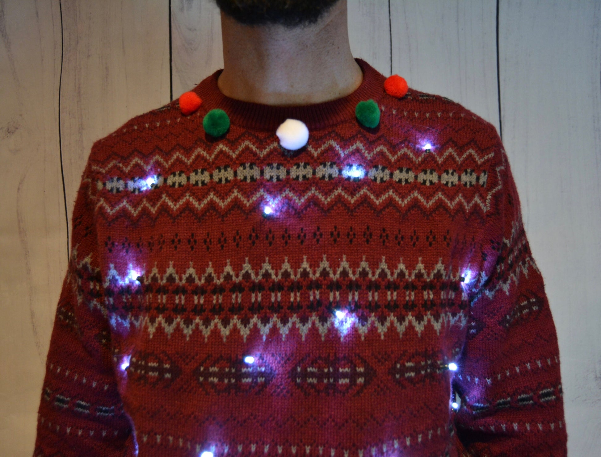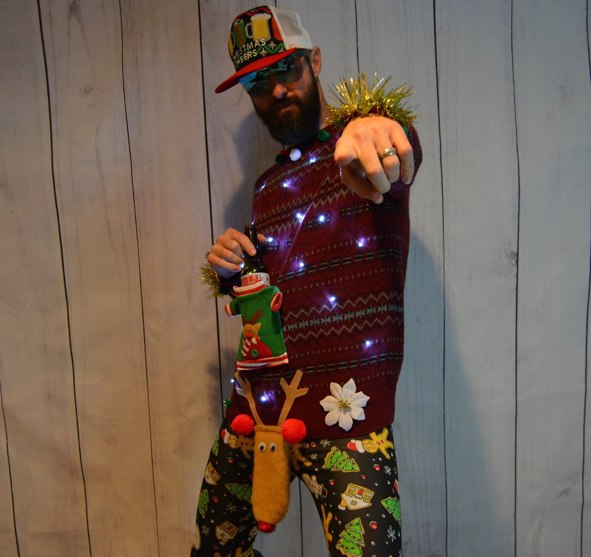 Reindeer looks like a.... You figure it out! LOL! Need a place to hold your alcohol? This Party Sweater has a little sweater pocket that can hold your beer, It can also hold bottles or cans of soda, flasks, cigarettes, weed, snacks, candy canes, or whatever fun items you can think of!! It also has white Christmas lights. You can wear this sweater for all your holiday events! Ugly sweater party, New years eve party, or Skiing on the mountain, the possibilities are endless! Flip the lights on for some extra fun!