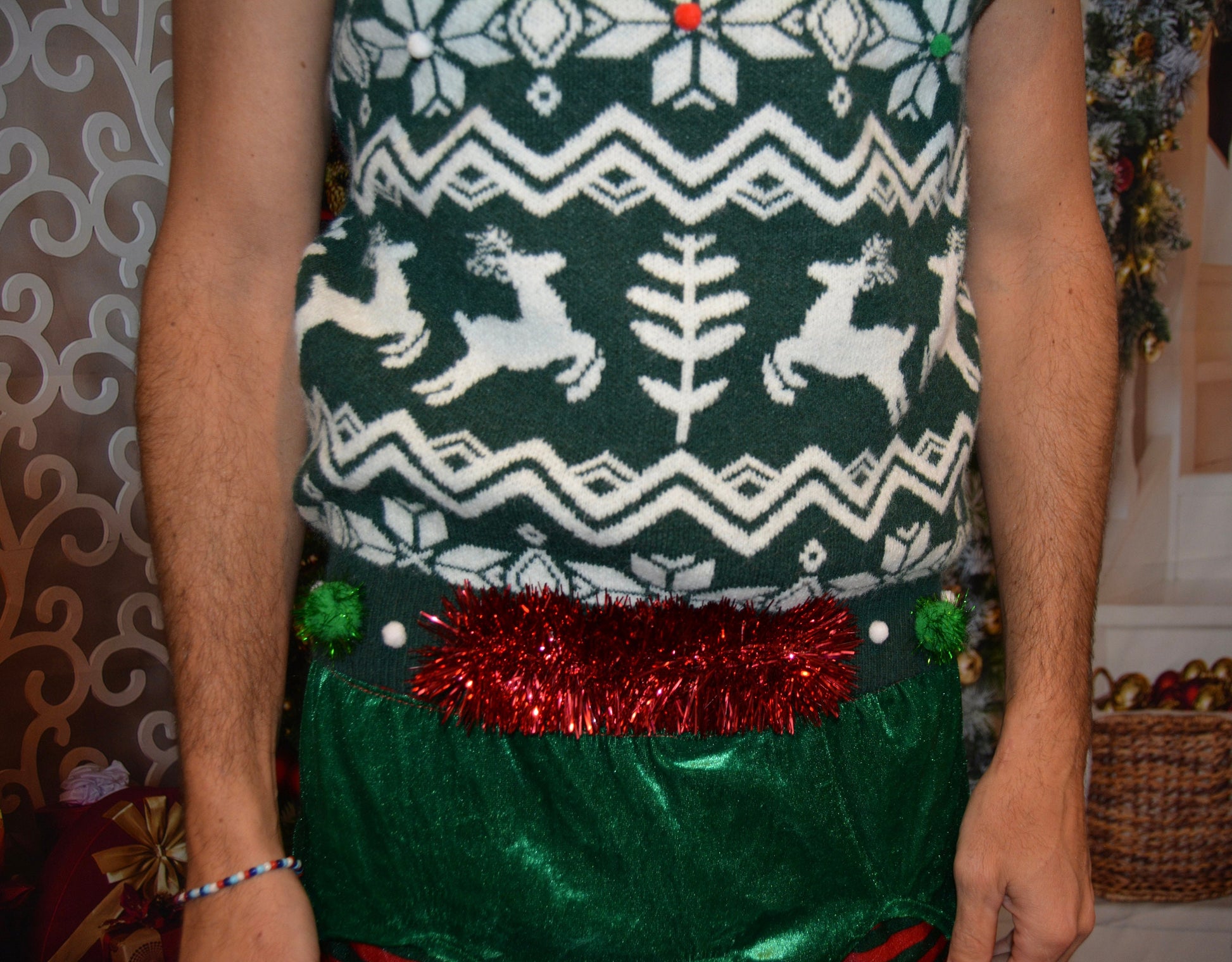 Check out this totally unique Ugly sweater! It is a soft green vest with a fun reindeer hand puppet!