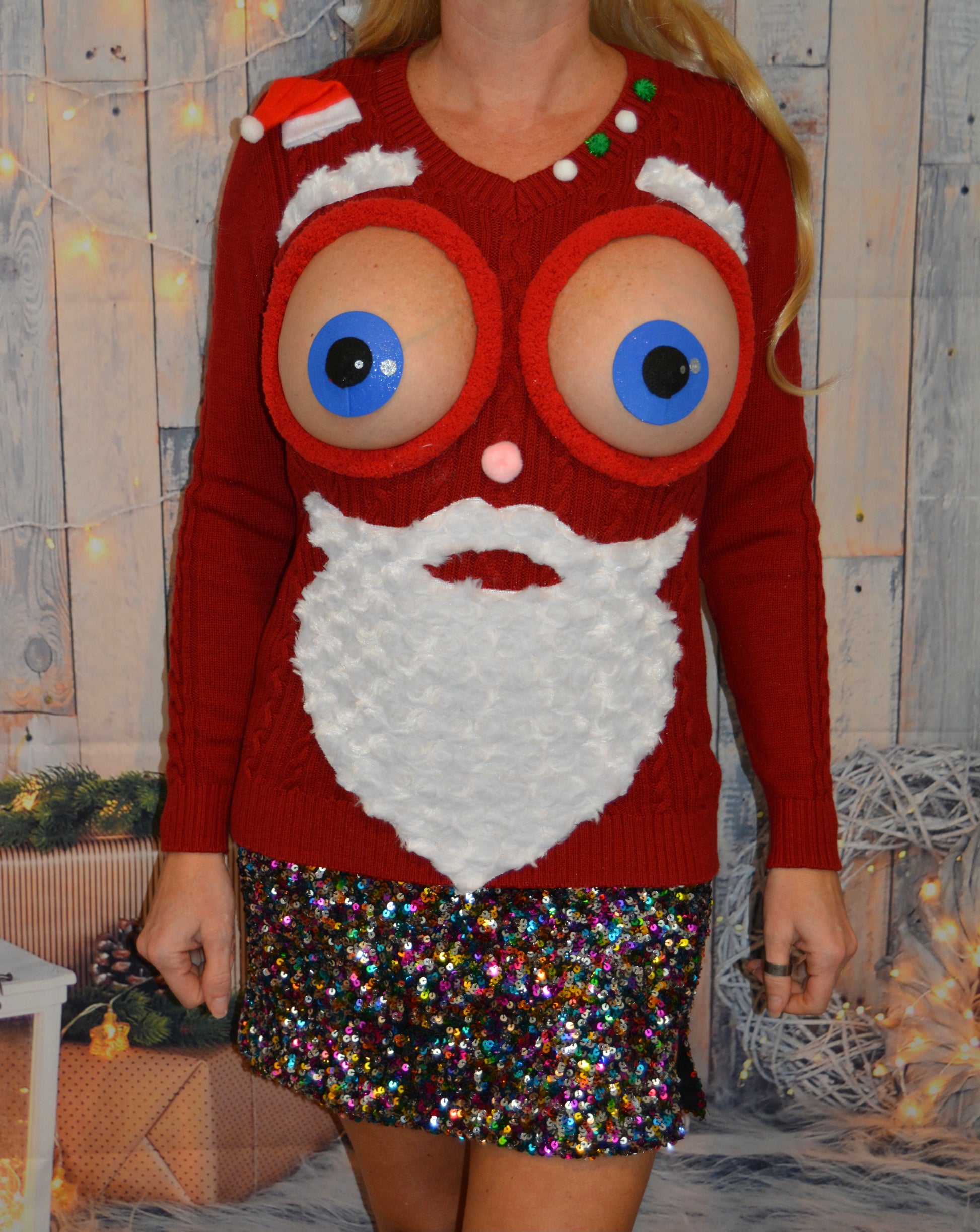 - **The holes are for your actual breasts, IT IS NOT PLASTIC or an insert. :)*** If you want to stand out at your Ugly Sweater Party, then this bug eyed Santa sweater is for you!!