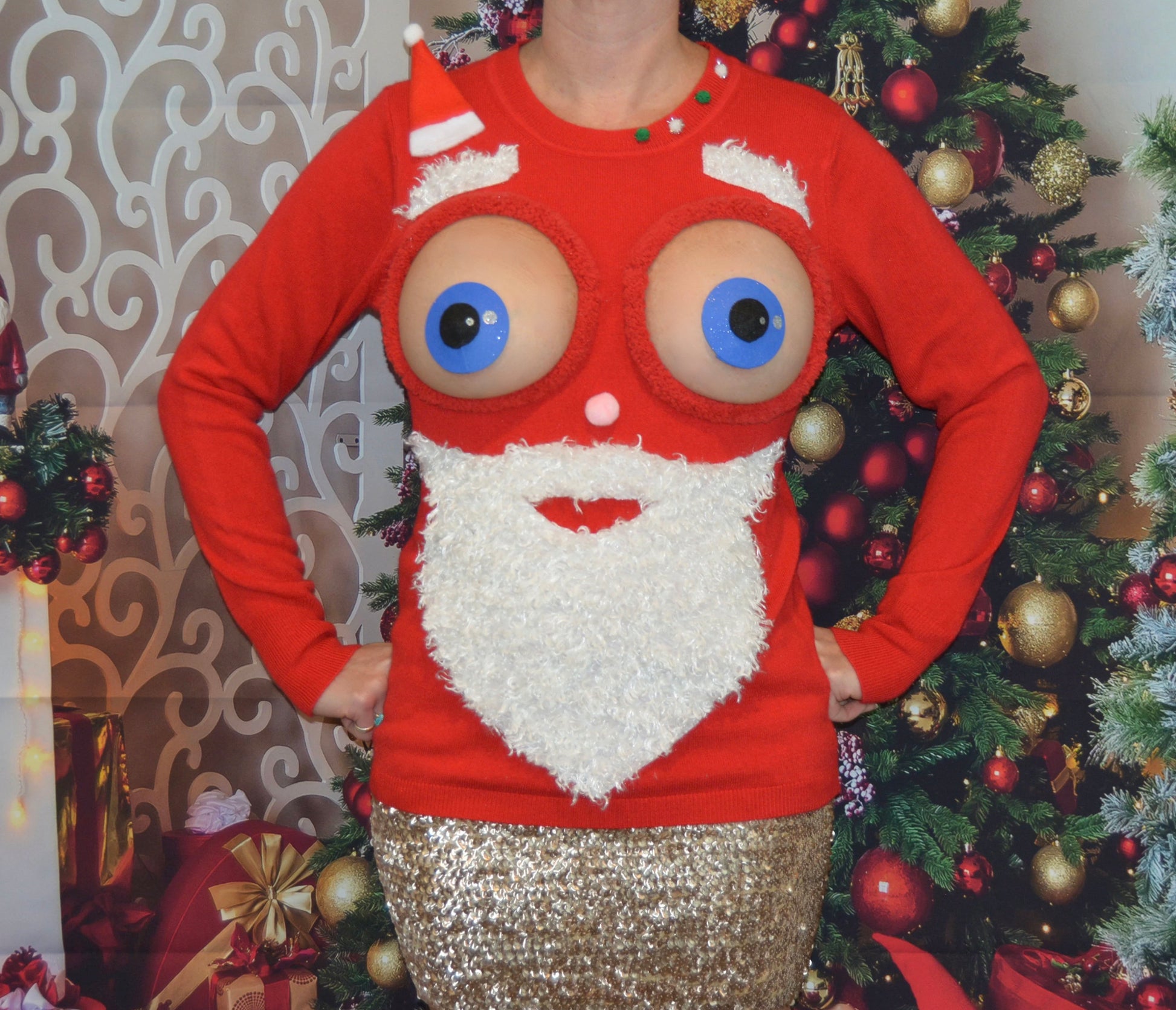 Santa face, sexy ugly Christmas Sweater, bug eyed santa, Made for your bare breasts, boob eyes, see details, breast, dress, multi versions