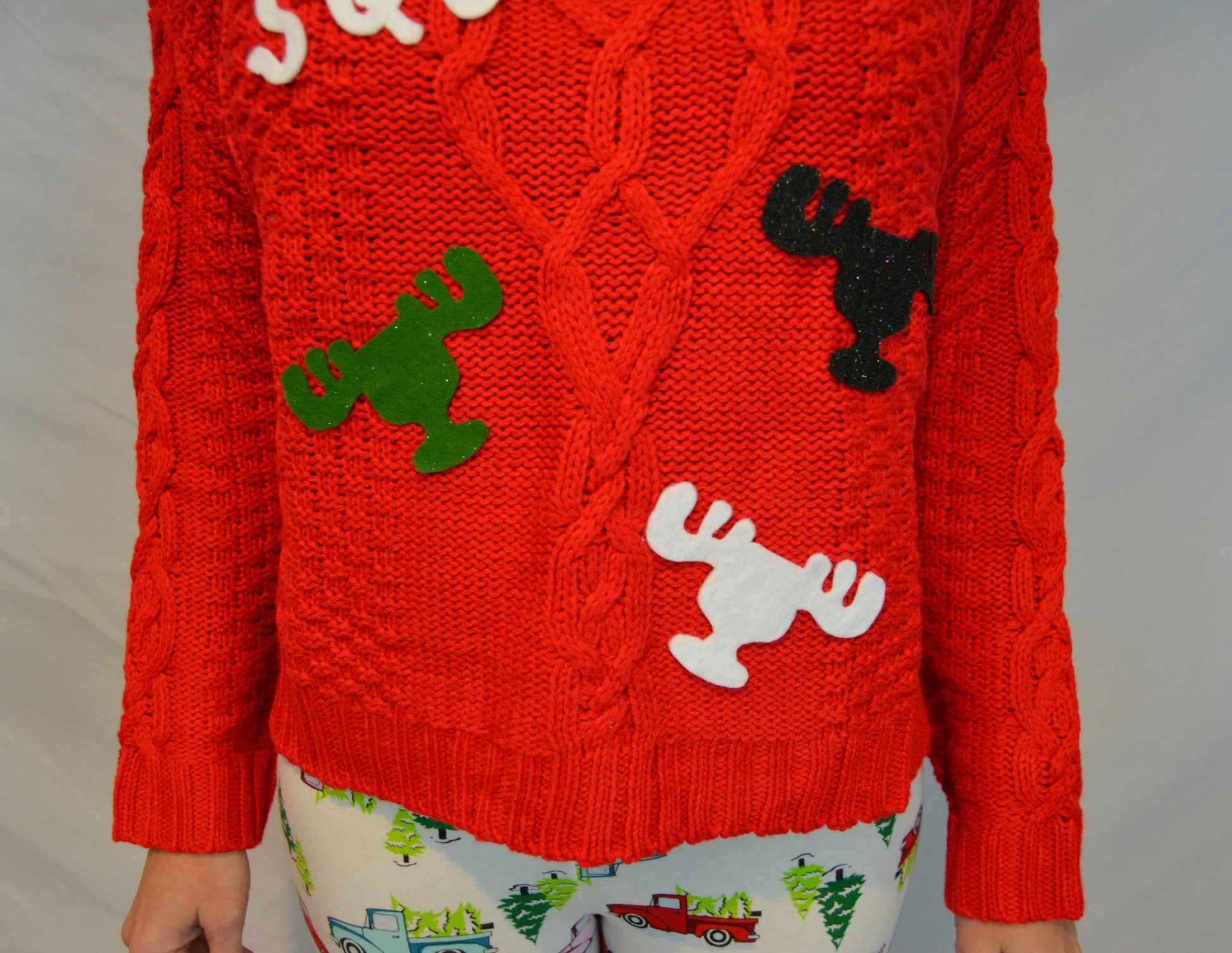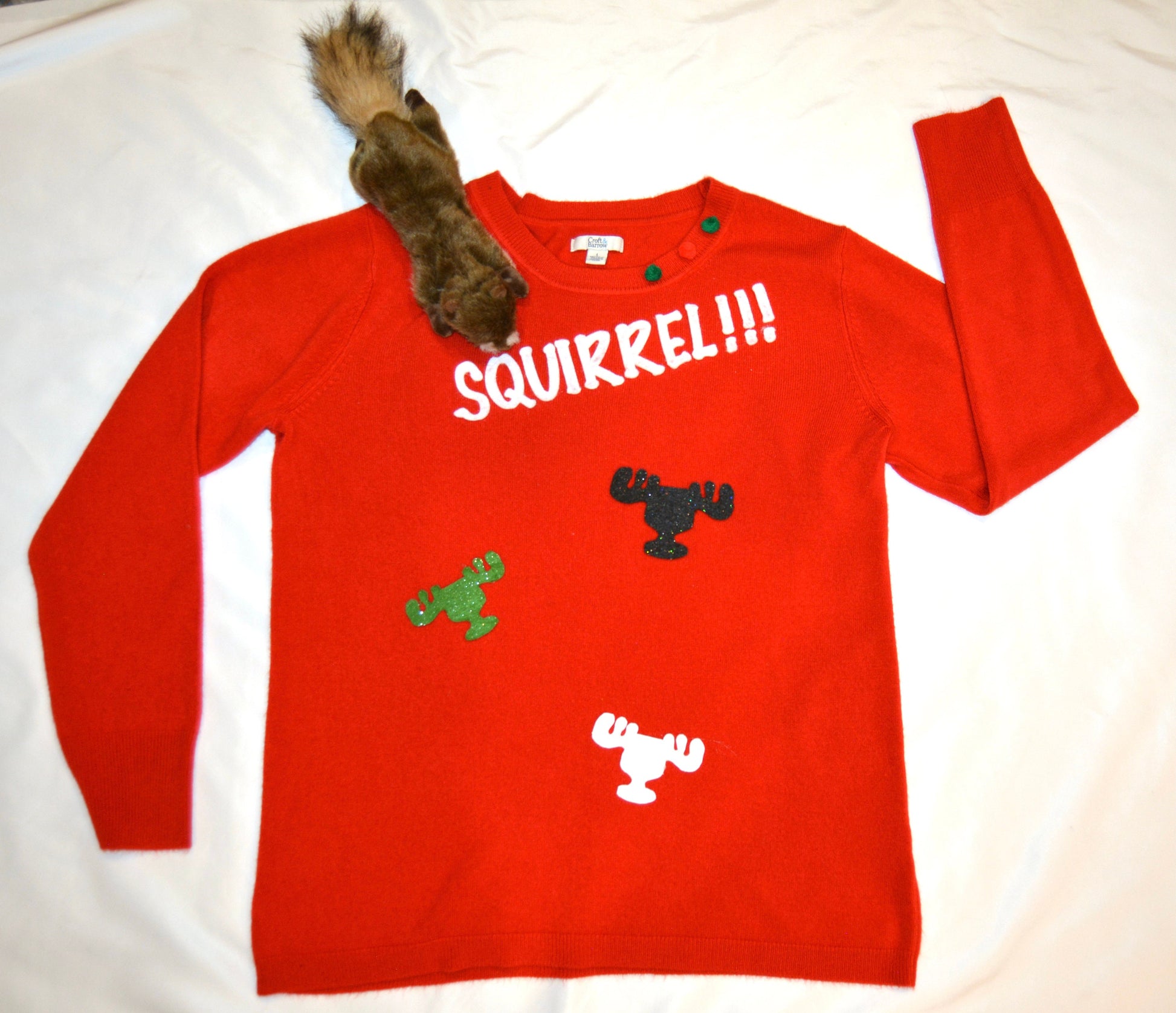 Same or next day shipping. The postal service is running slow so we are getting orders out ASAP. Squirrel!!!! Stand out with this fantastic National Lampoons Christmas vacation inspired PARTY Sweater at your Ugly Sweater Party this holiday season!! We created this sweater to make you laugh and be terrified of the attack squirrel on your sweater! MEASUREMENTS I am using some different base sweaters for the red one because of all the dang shortages and inflation. The red sweaters are a regular relaxed fit round neck or v neck, smooth or textured knit. If you have size questions send me a message and I'll be happy to help. Or if you want to know which sweater you will receive.This is a NOVELTY item. Do not machine wash/dry, spot clean by hand due to custom appliquéd details, hang dry.