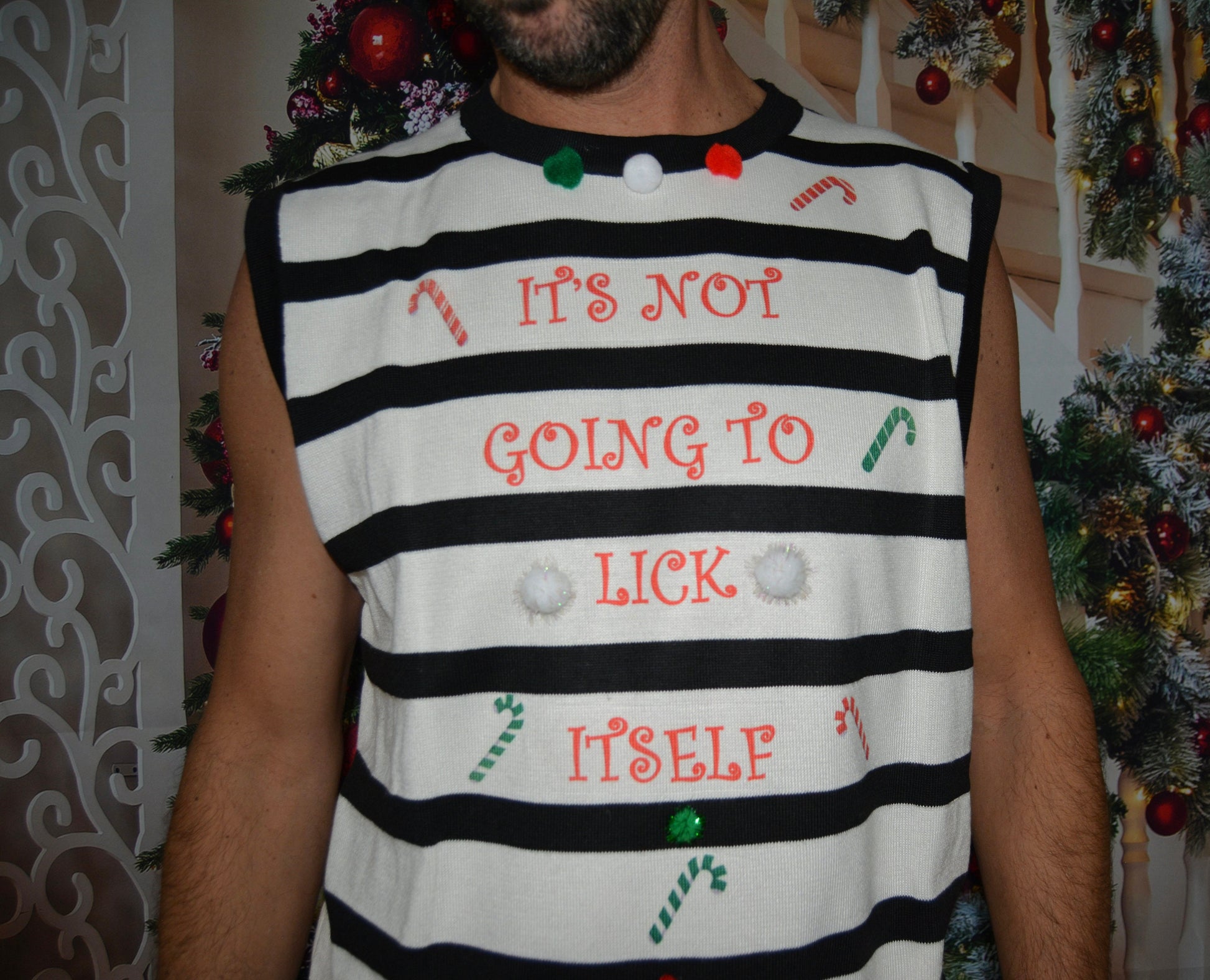 XL, Ugly Christmas Sweater men, vest, It's not going to lick itself, naughty, Contest winner, xmas sweater, funny, candy cane, perverted